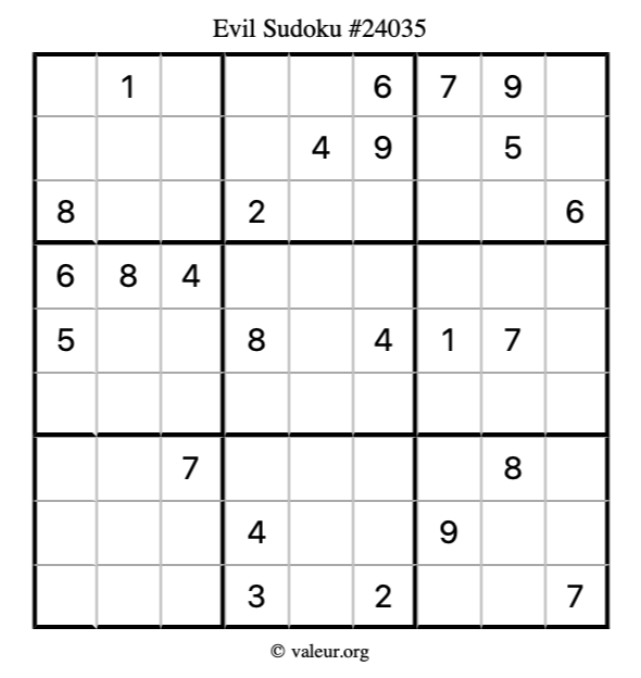 Here is our printable Evil Sudoku Puzzle #24035. You are welcome to print a copy for yourself and solve it the old-fashioned way with a pencil and an eraser!