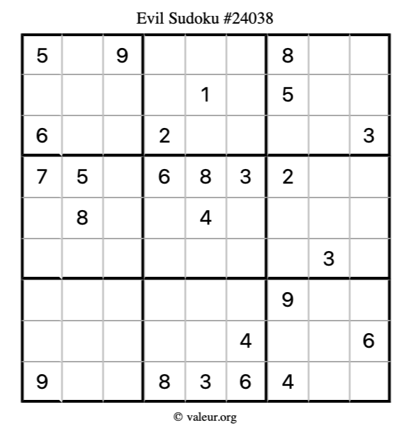 Here is our printable Evil Sudoku Puzzle #24038. You are welcome to print a copy for yourself and solve it the old-fashioned way with a pencil and an eraser!