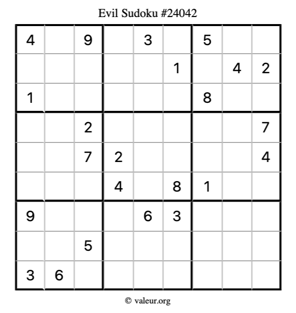 Here is our printable Evil Sudoku Puzzle #24042. You are welcome to print a copy for yourself and solve it the old-fashioned way with a pencil and an eraser!