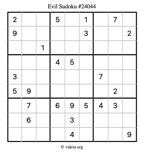 Here is our printable Evil Sudoku Puzzle #24044. You are welcome to print a copy for yourself and solve it the old-fashioned way with a pencil and an eraser!