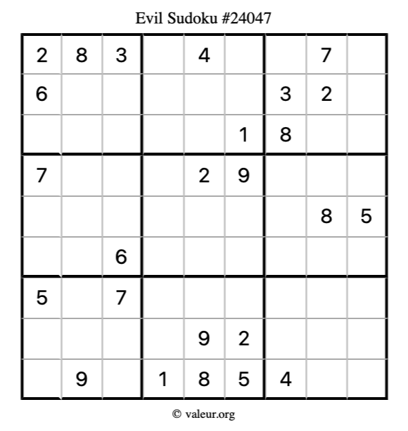 Here is our printable Evil Sudoku Puzzle #24047. You are welcome to print a copy for yourself and solve it the old-fashioned way with a pencil and an eraser!