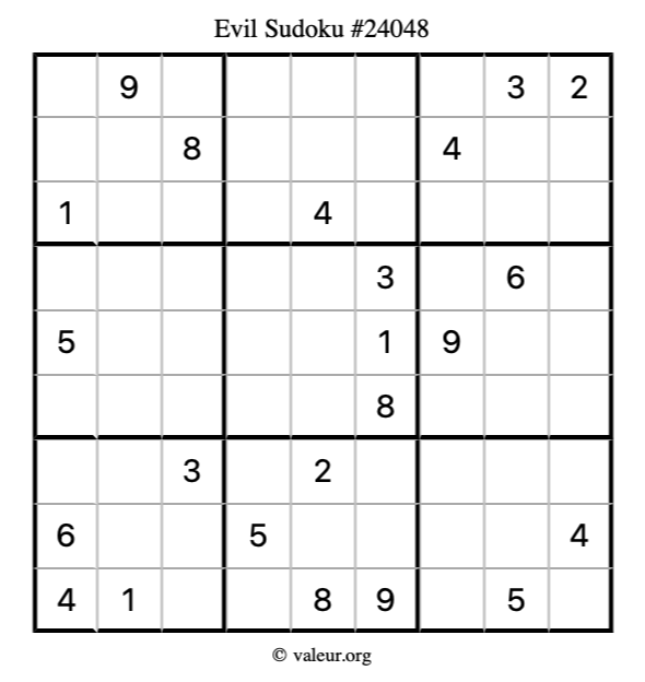 Here is our printable Evil Sudoku Puzzle #24048. You are welcome to print a copy for yourself and solve it the old-fashioned way with a pencil and an eraser!