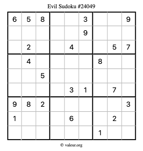 Here is our printable Evil Sudoku Puzzle #24049. You are welcome to print a copy for yourself and solve it the old-fashioned way with a pencil and an eraser!