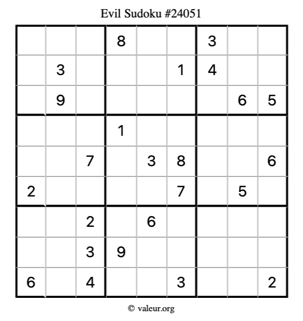 Here is our printable Evil Sudoku Puzzle #24051. You are welcome to print a copy for yourself and solve it the old-fashioned way with a pencil and an eraser!