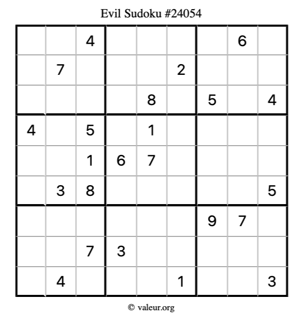 Here is our printable Evil Sudoku Puzzle #24054. You are welcome to print a copy for yourself and solve it the old-fashioned way with a pencil and an eraser!