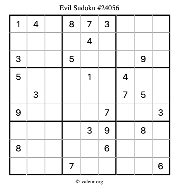 Here is our printable Evil Sudoku Puzzle #24056. You are welcome to print a copy for yourself and solve it the old-fashioned way with a pencil and an eraser!