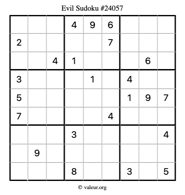 Evil Sudoku puzzle #24057 is not the only evil Sudoku puzzle in our database. We have thousands of evil Sudoku puzzles that you can print and solve. Check them out here!
