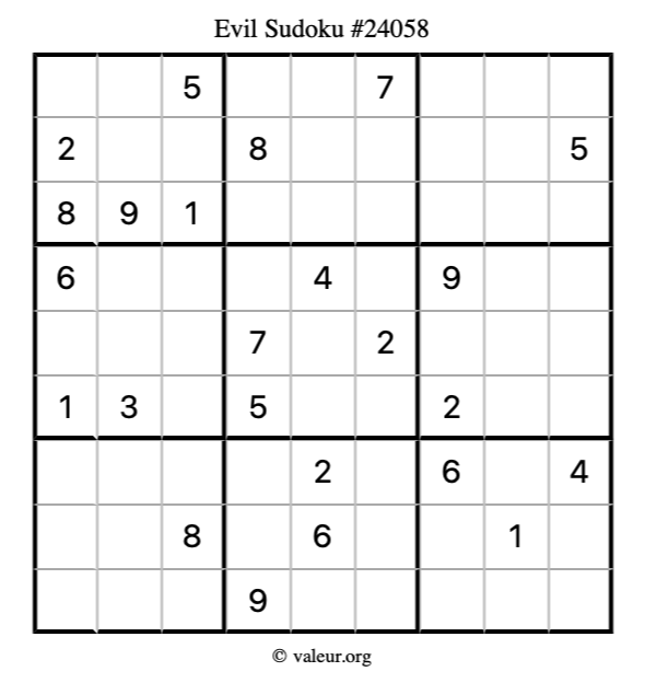 Here is our printable Evil Sudoku Puzzle #24058. You are welcome to print a copy for yourself and solve it the old-fashioned way with a pencil and an eraser!