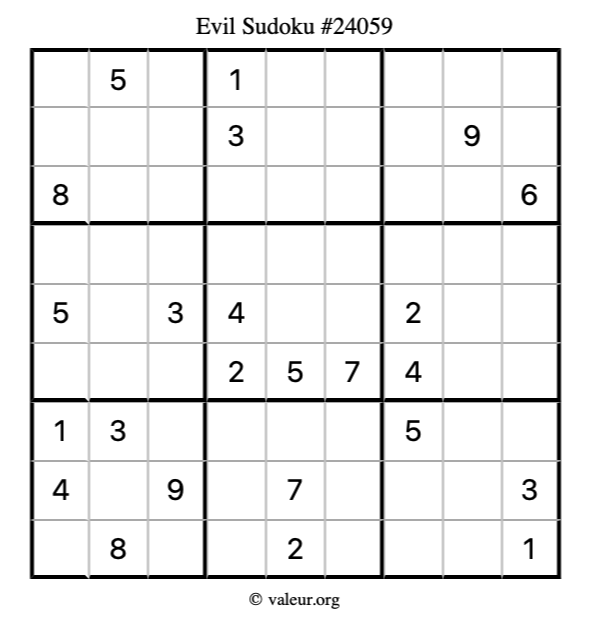 Here is our printable Evil Sudoku Puzzle #24059. You are welcome to print a copy for yourself and solve it the old-fashioned way with a pencil and an eraser!