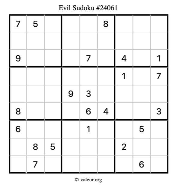 Here is our printable Evil Sudoku Puzzle #24061. You are welcome to print a copy for yourself and solve it the old-fashioned way with a pencil and an eraser!