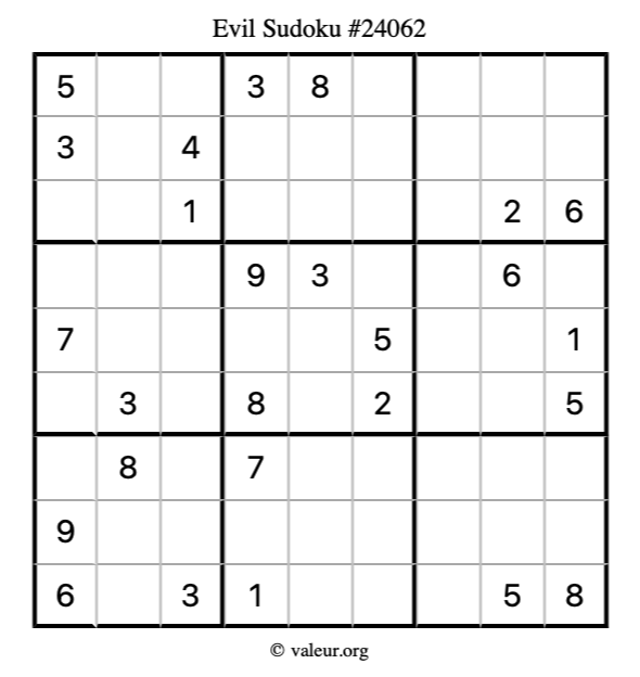 Here is our printable Evil Sudoku Puzzle #24062. You are welcome to print a copy for yourself and solve it the old-fashioned way with a pencil and an eraser!