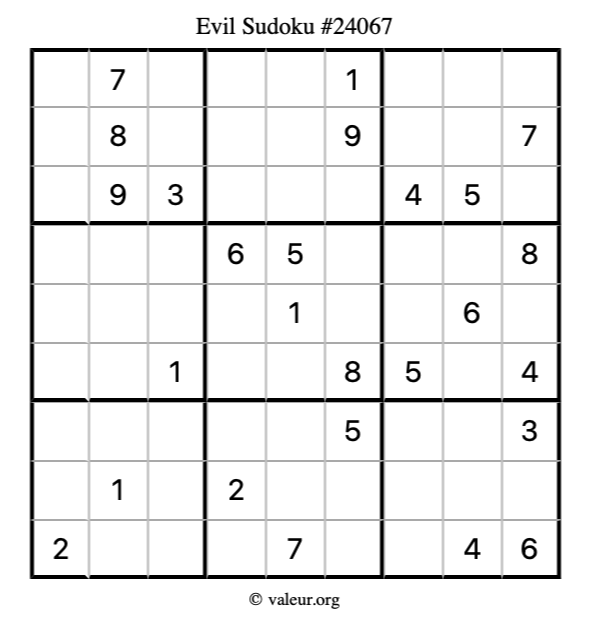 Here is our printable Evil Sudoku Puzzle #24067. You are welcome to print a copy for yourself and solve it the old-fashioned way with a pencil and an eraser!