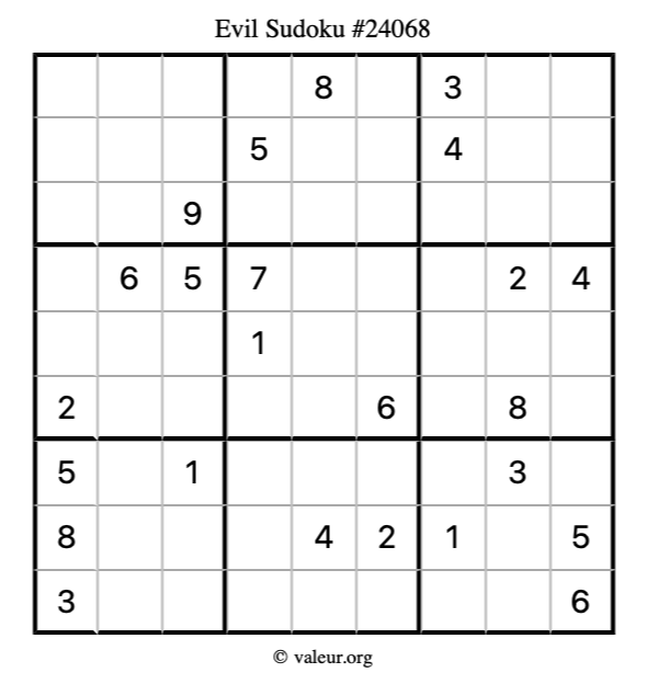 Here is our printable Evil Sudoku Puzzle #24068. You are welcome to print a copy for yourself and solve it the old-fashioned way with a pencil and an eraser!
