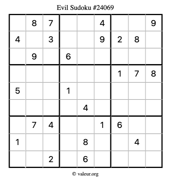 Here is our printable Evil Sudoku Puzzle #24069. You are welcome to print a copy for yourself and solve it the old-fashioned way with a pencil and an eraser!
