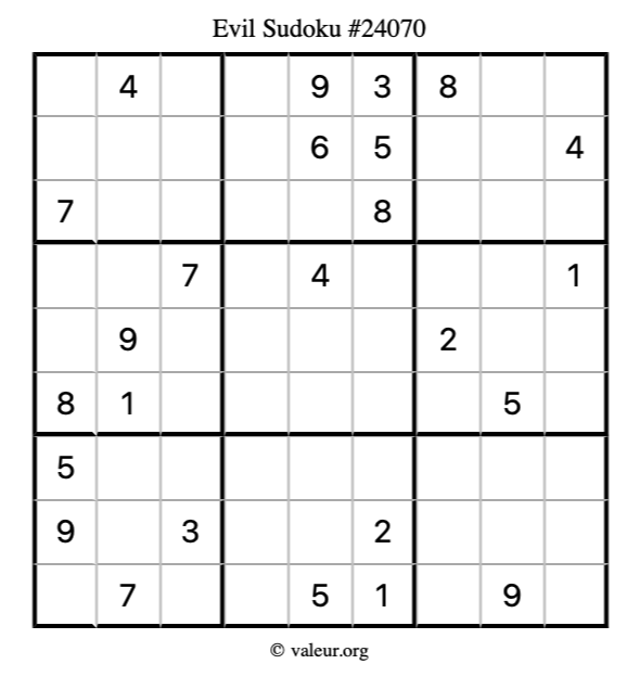 Here is our printable Evil Sudoku Puzzle #24070. You are welcome to print a copy for yourself and solve it the old-fashioned way with a pencil and an eraser!