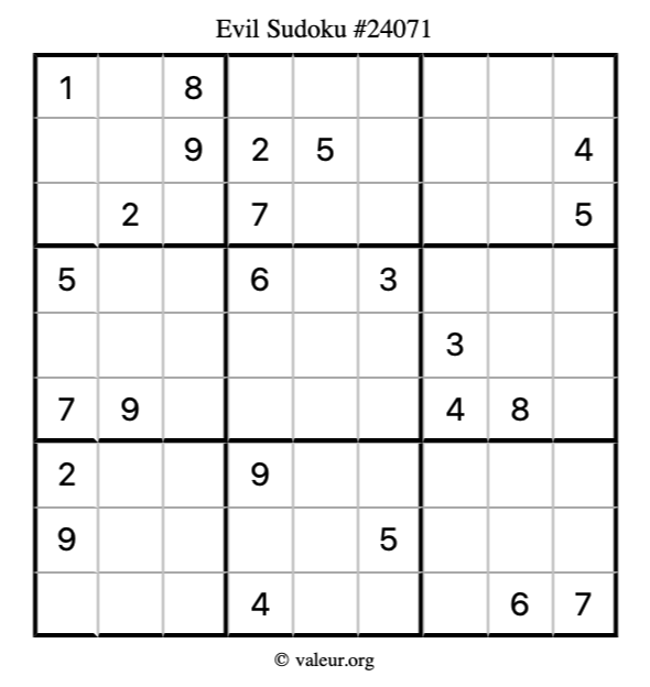 Here is our printable Evil Sudoku Puzzle #24071. You are welcome to print a copy for yourself and solve it the old-fashioned way with a pencil and an eraser!