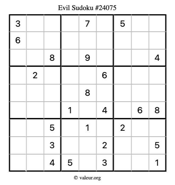 Here is our printable Evil Sudoku Puzzle #24075. You are welcome to print a copy for yourself and solve it the old-fashioned way with a pencil and an eraser!