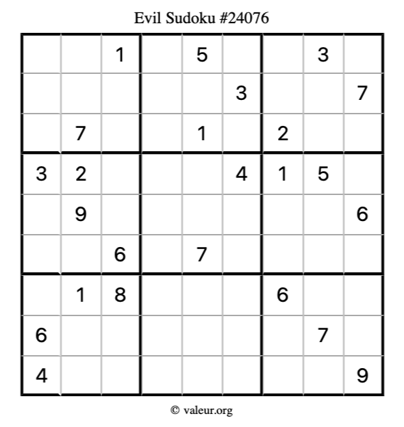 Here is our printable Evil Sudoku Puzzle #24076. You are welcome to print a copy for yourself and solve it the old-fashioned way with a pencil and an eraser!