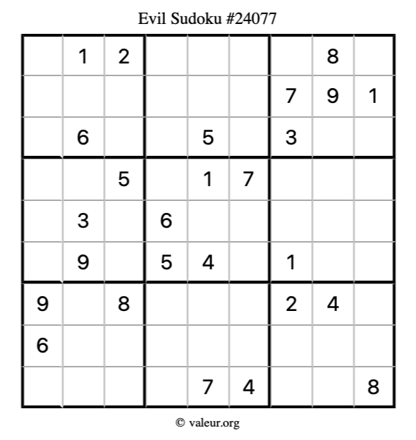 Here is our printable Evil Sudoku Puzzle #24077. You are welcome to print a copy for yourself and solve it the old-fashioned way with a pencil and an eraser!