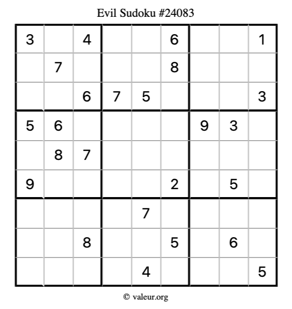 Here is our printable Evil Sudoku Puzzle #24083. You are welcome to print a copy for yourself and solve it the old-fashioned way with a pencil and an eraser!
