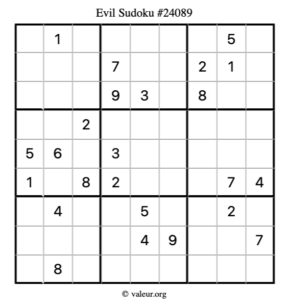 Here is our printable Evil Sudoku Puzzle #24089. You are welcome to print a copy for yourself and solve it the old-fashioned way with a pencil and an eraser!