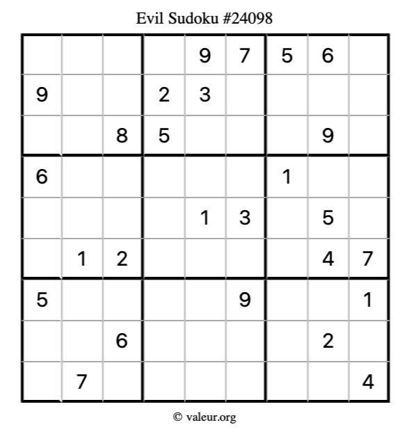 Here is our printable Evil Sudoku Puzzle #24098. You are welcome to print a copy for yourself and solve it the old-fashioned way with a pencil and an eraser!