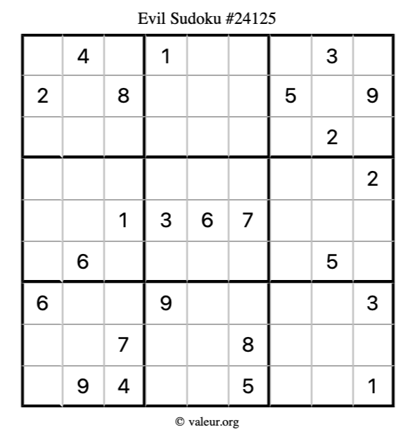 Here is our printable Evil Sudoku Puzzle #24125. You are welcome to print a copy for yourself and solve it the old-fashioned way with a pencil and an eraser!