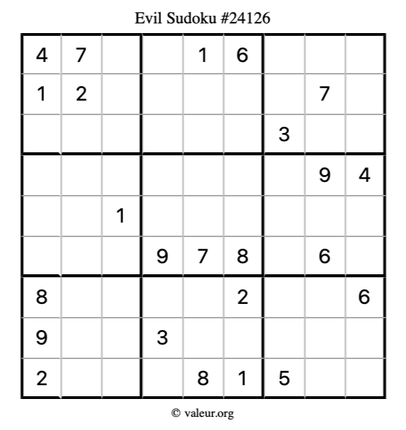 Here is our printable Evil Sudoku Puzzle #24126. You are welcome to print a copy for yourself and solve it the old-fashioned way with a pencil and an eraser!