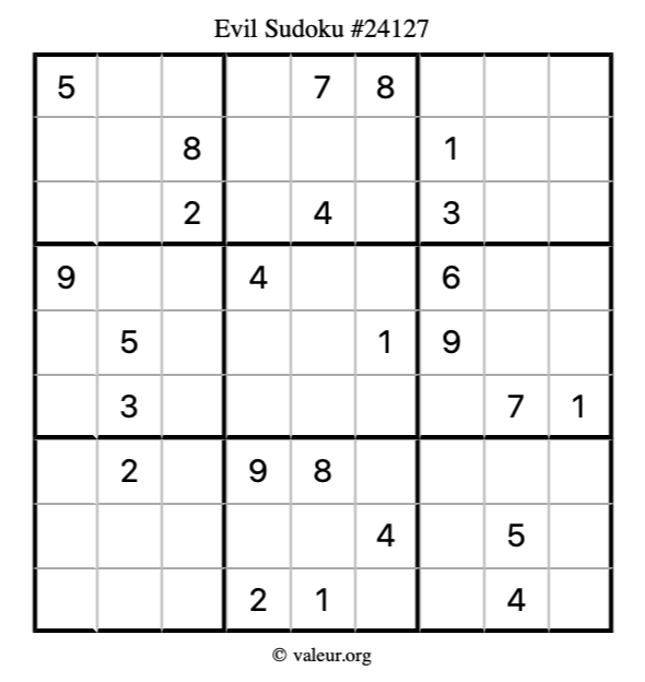 Here is our printable Evil Sudoku Puzzle #24127. You are welcome to print a copy for yourself and solve it the old-fashioned way with a pencil and an eraser!