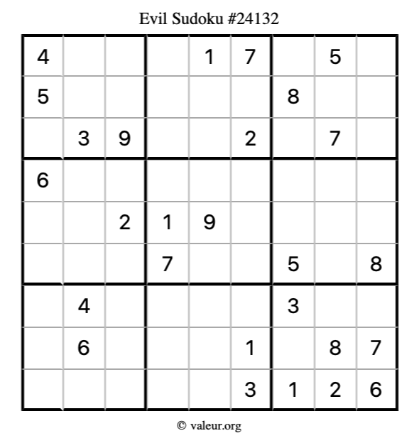 Here is our printable Evil Sudoku Puzzle #24132. You are welcome to print a copy for yourself and solve it the old-fashioned way with a pencil and an eraser!