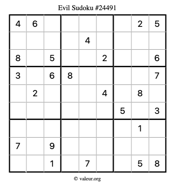 Here is our printable Evil Sudoku Puzzle #24491. You are welcome to print a copy for yourself and solve it the old-fashioned way with a pencil and an eraser!