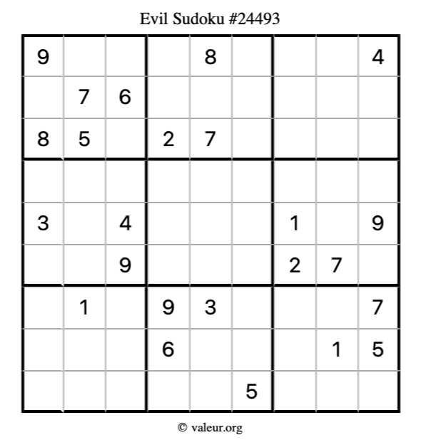 Here is our printable Evil Sudoku Puzzle #24493. You are welcome to print a copy for yourself and solve it the old-fashioned way with a pencil and an eraser!