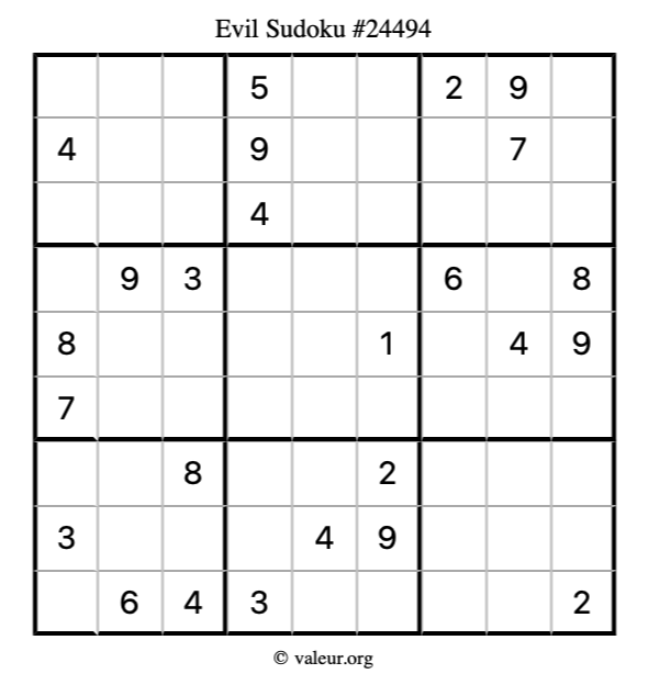 Here is our printable Evil Sudoku Puzzle #24494. You are welcome to print a copy for yourself and solve it the old-fashioned way with a pencil and an eraser!