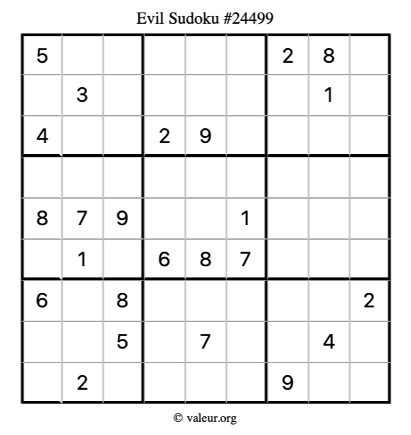 Here is our printable Evil Sudoku Puzzle #24499. You are welcome to print a copy for yourself and solve it the old-fashioned way with a pencil and an eraser!