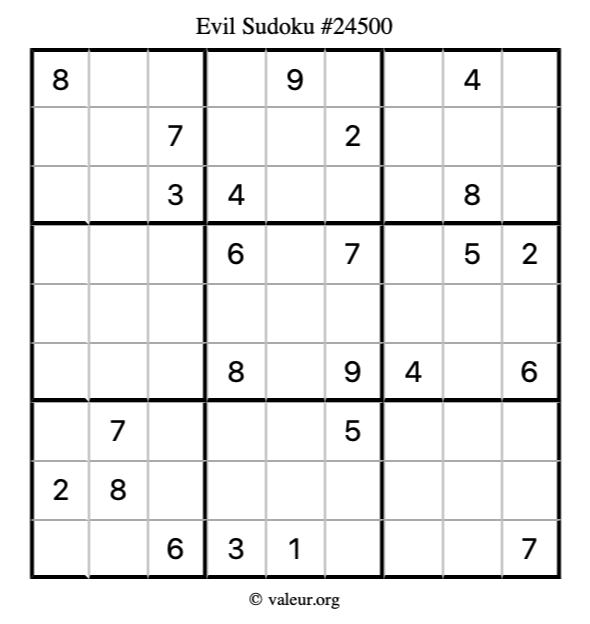 Evil Sudoku puzzle #24500 is not the only evil Sudoku puzzle in our database. We have thousands of evil Sudoku puzzles that you can print and solve. Check them out here!
