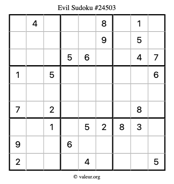 Here is our printable Evil Sudoku Puzzle #24503. You are welcome to print a copy for yourself and solve it the old-fashioned way with a pencil and an eraser!