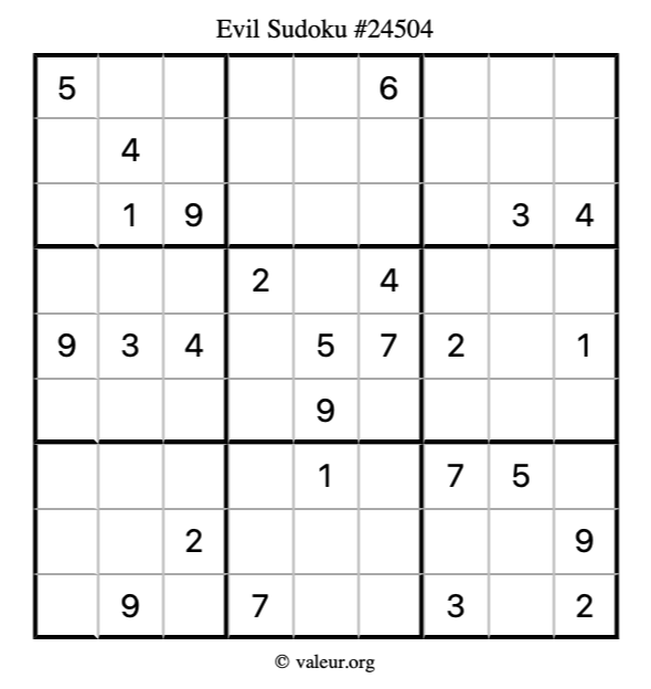 Here is our printable Evil Sudoku Puzzle #24504. You are welcome to print a copy for yourself and solve it the old-fashioned way with a pencil and an eraser!