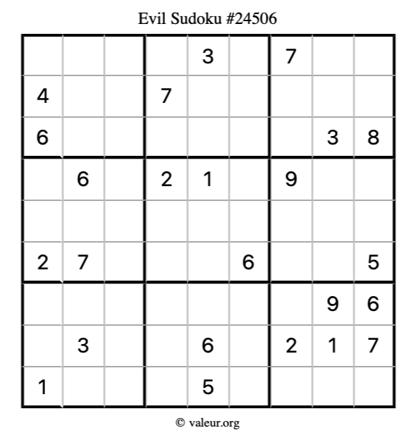 Here is our printable Evil Sudoku Puzzle #24506. You are welcome to print a copy for yourself and solve it the old-fashioned way with a pencil and an eraser!