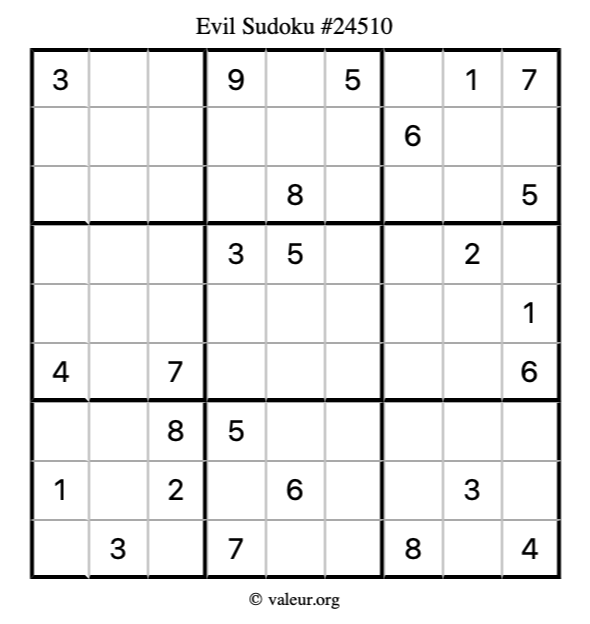 Here is our printable Evil Sudoku Puzzle #24510. You are welcome to print a copy for yourself and solve it the old-fashioned way with a pencil and an eraser!