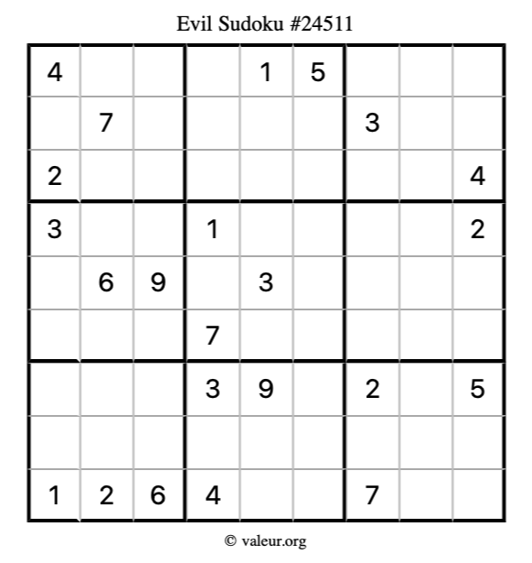 Here is our printable Evil Sudoku Puzzle #24511. You are welcome to print a copy for yourself and solve it the old-fashioned way with a pencil and an eraser!