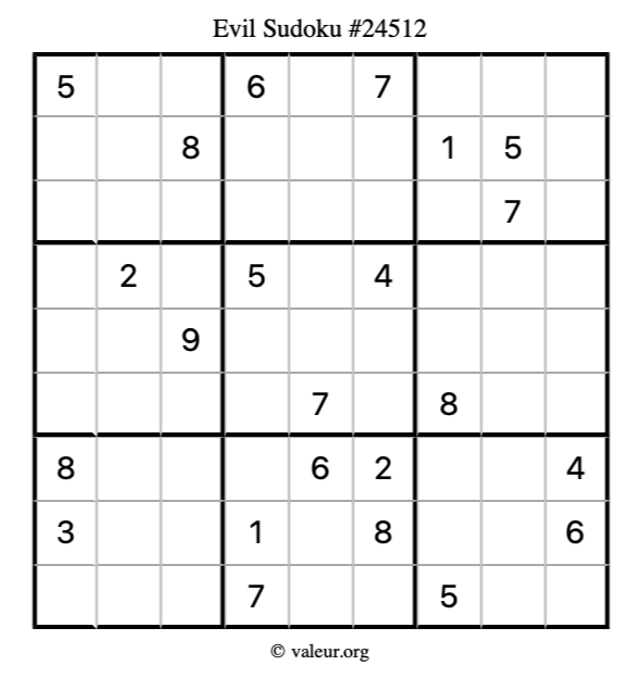 Here is our printable Evil Sudoku Puzzle #24512. You are welcome to print a copy for yourself and solve it the old-fashioned way with a pencil and an eraser!