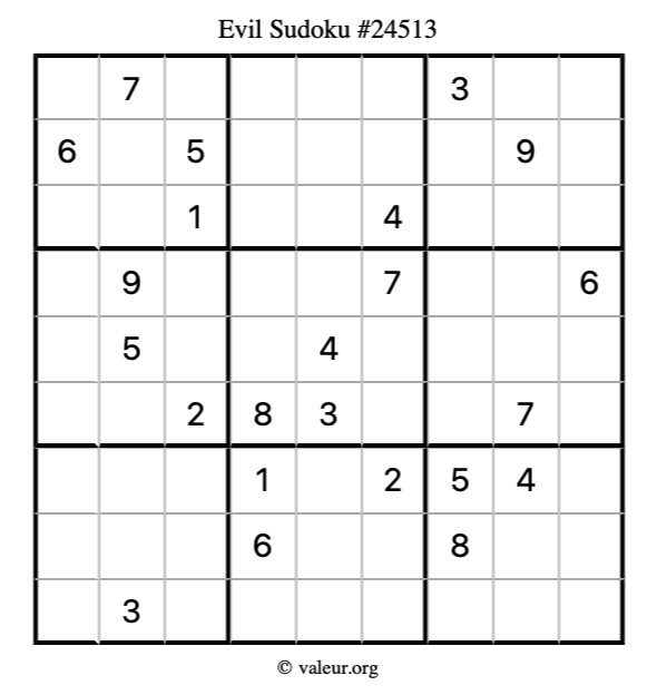 Here is our printable Evil Sudoku Puzzle #24513. You are welcome to print a copy for yourself and solve it the old-fashioned way with a pencil and an eraser!