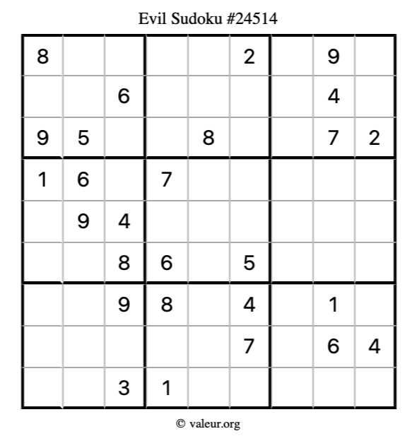 Here is our printable Evil Sudoku Puzzle #24514. You are welcome to print a copy for yourself and solve it the old-fashioned way with a pencil and an eraser!