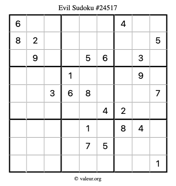 Here is our printable Evil Sudoku Puzzle #24517. You are welcome to print a copy for yourself and solve it the old-fashioned way with a pencil and an eraser!