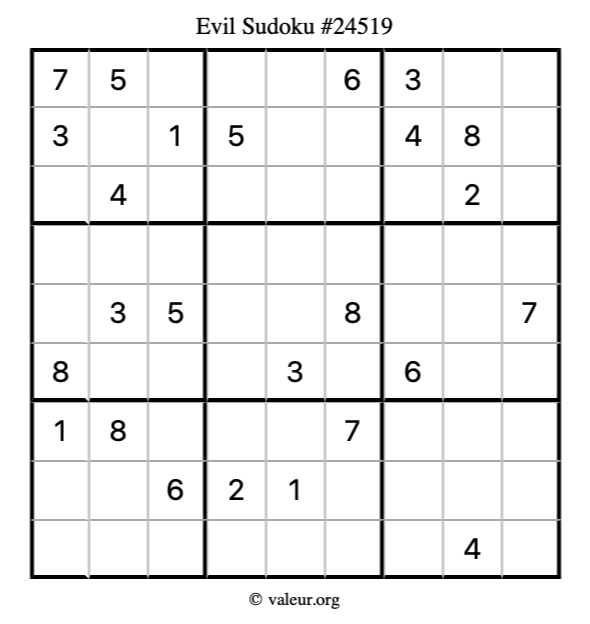 Here is our printable Evil Sudoku Puzzle #24519. You are welcome to print a copy for yourself and solve it the old-fashioned way with a pencil and an eraser!