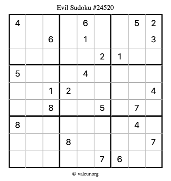 Here is our printable Evil Sudoku Puzzle #24520. You are welcome to print a copy for yourself and solve it the old-fashioned way with a pencil and an eraser!
