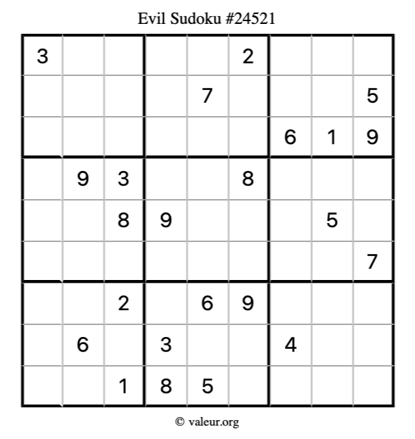Here is our printable Evil Sudoku Puzzle #24521. You are welcome to print a copy for yourself and solve it the old-fashioned way with a pencil and an eraser!