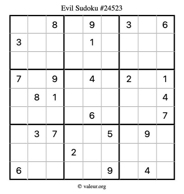 Here is our printable Evil Sudoku Puzzle #24523. You are welcome to print a copy for yourself and solve it the old-fashioned way with a pencil and an eraser!