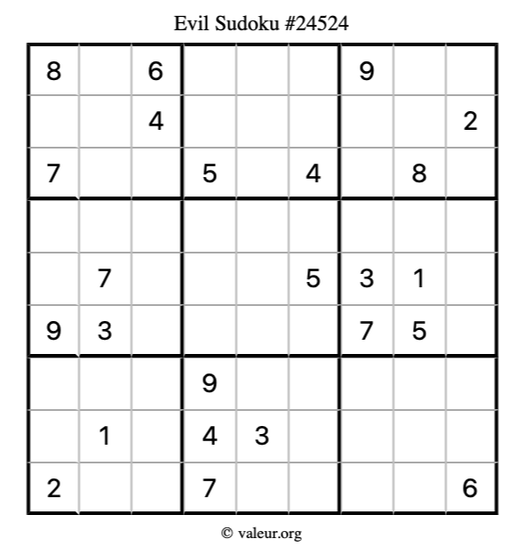 Here is our printable Evil Sudoku Puzzle #24524. You are welcome to print a copy for yourself and solve it the old-fashioned way with a pencil and an eraser!