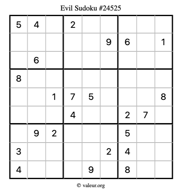 Evil Sudoku puzzle #24525 is not the only evil Sudoku puzzle in our database. We have thousands of evil Sudoku puzzles that you can print and solve. Check them out here!